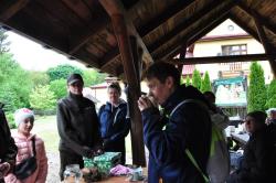 Pogoda nas jednak nie oszczędziła i odrobinę przemoczeni, ale w doskonałych humorach wszyscy dodarliśmy na obiekt edukacyjny. Wysuszyliśmy się przy ognisku, zjedliśmy grochówkę i zasłużoną kiełbaskę.