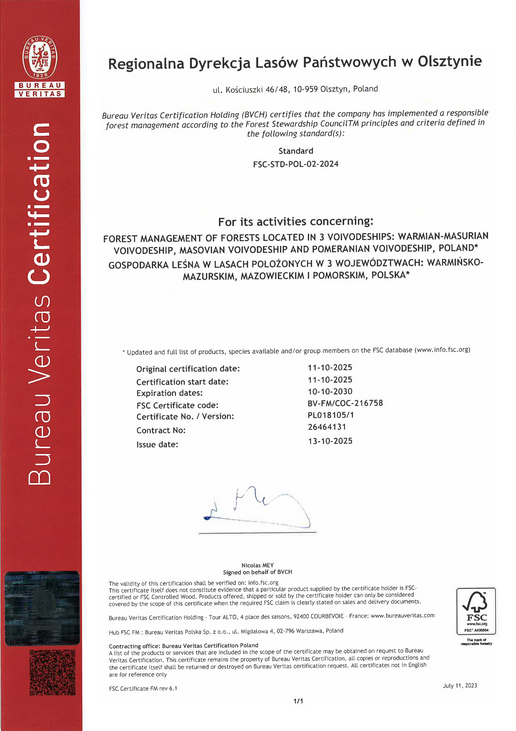 Certyfikat RDLP w Olsztynie został wydany 11 października 2025 roku i zachowuje ważność do 10 października 2030 roku (numer certyfikatu: BV-FM/COC-216758, PL018105/1).