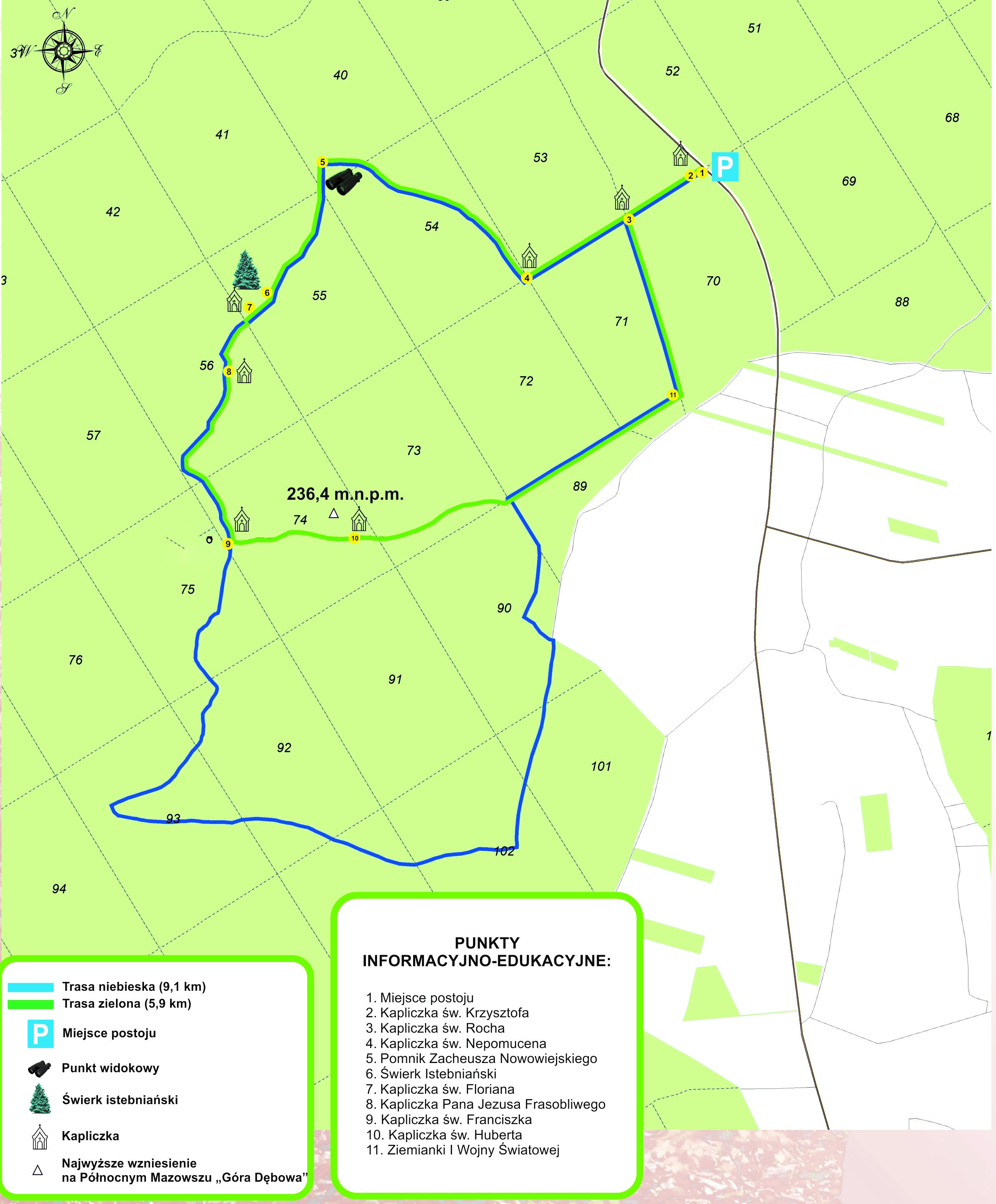 Pierwsza ścieżka – rekreacyjna o długości ok. 5 km, prowadzi przez miejscowość Obórki, dłuższy szlak przebiega przy miejscu postoju, kapliczce św. Huberta i ma długość ok. 10 km. Oba szlaki mają swój początek, a zarazem koniec w miejscowości Przejmy przy leśniczówce, obiekcie i ścieżce edukacyjnej Przejmy. Szlaki zostały nietrwale oznakowane na drzewach niebieskim symbolem jak dla ścieżek spacerowych.